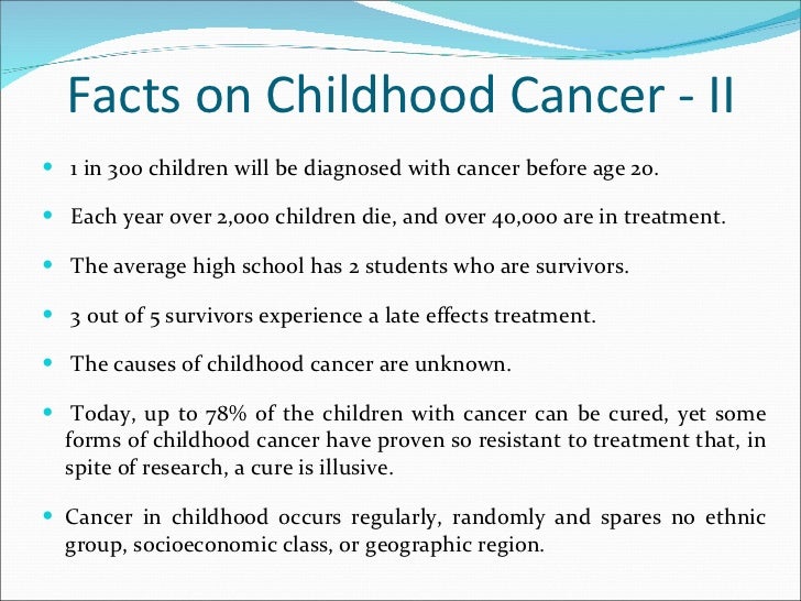 Childhood Cancer Gabby Kulikowski Kellie Campbell Ppt Download from images.slideplayer.com Can children who have cancer be treated at the national institutes of health (nih) clinical center? · 20 cancer staging for lymphomas and solid tumors · 21 causes of childhood cancer · 21. Childhood cancer refers to cancer in children under the age of 15. Your child's cancer care team can help you understand your child's cancer and the best options for treatment. Still, cancer is one of the leading causes of death in children, so it is important to be aware of the signs and symptoms of cancer in children. Some children inherit dna changes (mutations) from a parent that increase their risk of certain types of cancer. At present, childhood cancer cannot be prevented. Childhood cancers are different to those affecting adults and despite a wealth of research, much uncertainty remains over the causes of childhood read personal blogs from families who have been affected by childhood cancer.